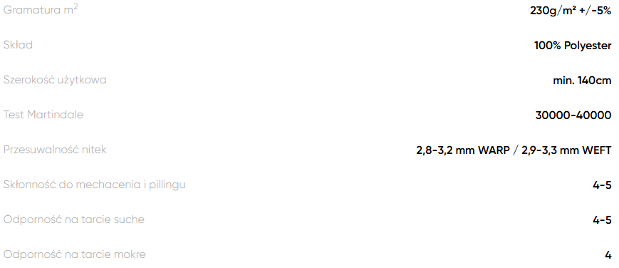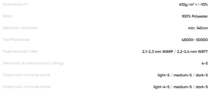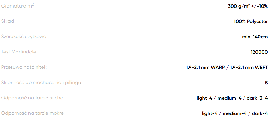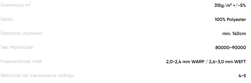 Materiał charakteryzuje się przyjemną w dotyku powierzchnią oraz solidnym, zwartym splotem, co przekłada się na komfort użytkowania i estetyczny wygląd mebli przez długi czas.