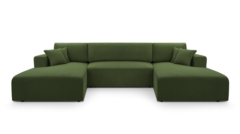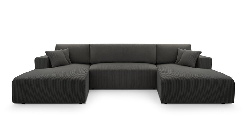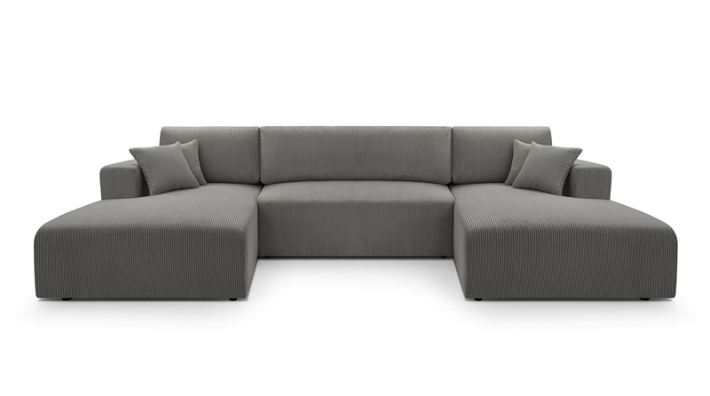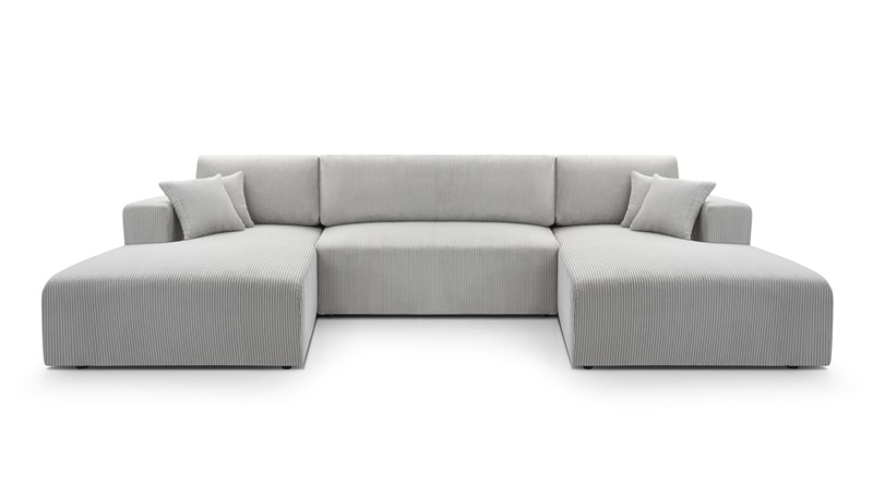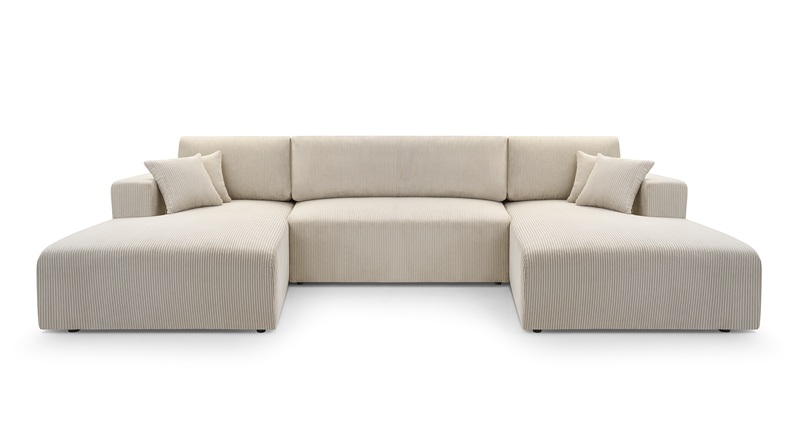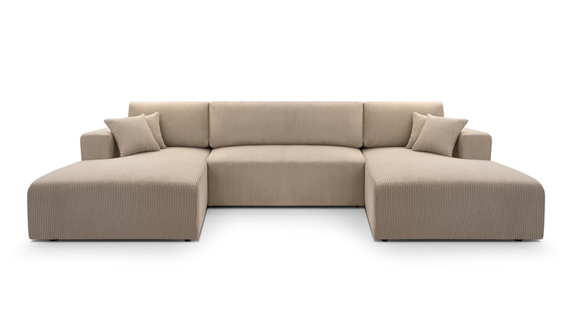 Nowoczesny, duży narożnik MOA w kształcie litery U z funkcją spania i pojemnikiem na pościel. Tapicerowany miękką, sztruksową tkaniną. Idealny do salonu w stylu minimalistycznym lub skandynawskim. Komfortowy w codziennym użytkowaniu, praktyczny i estetyczny. Idealnie nadający się do większych pomieszczeń. Ozdobne poduszki nadają przytulności. Uniwersalność designu sprawia, że narożnik odnajdzie się w wielu stylach wnętrz.