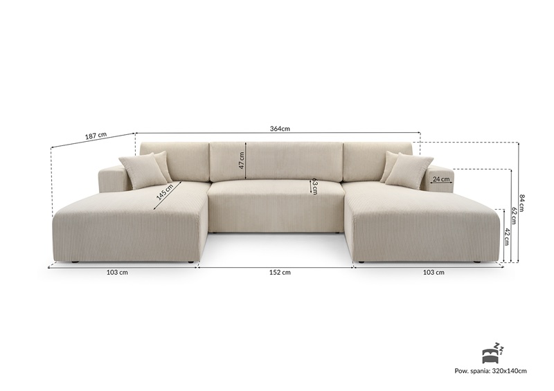 Nowoczesny, modułowy narożnik MOA z funkcją spania o powierzchni 320 × 140 cm, idealny do codziennego wypoczynku i okazjonalnego snu. Siedzisko wykonane z pianki PU oraz sprężyn falistych zapewnia wysoki komfort użytkowania, natomiast oparcie z pianki PU i sprężyn bonell gwarantuje odpowiednie podparcie pleców.