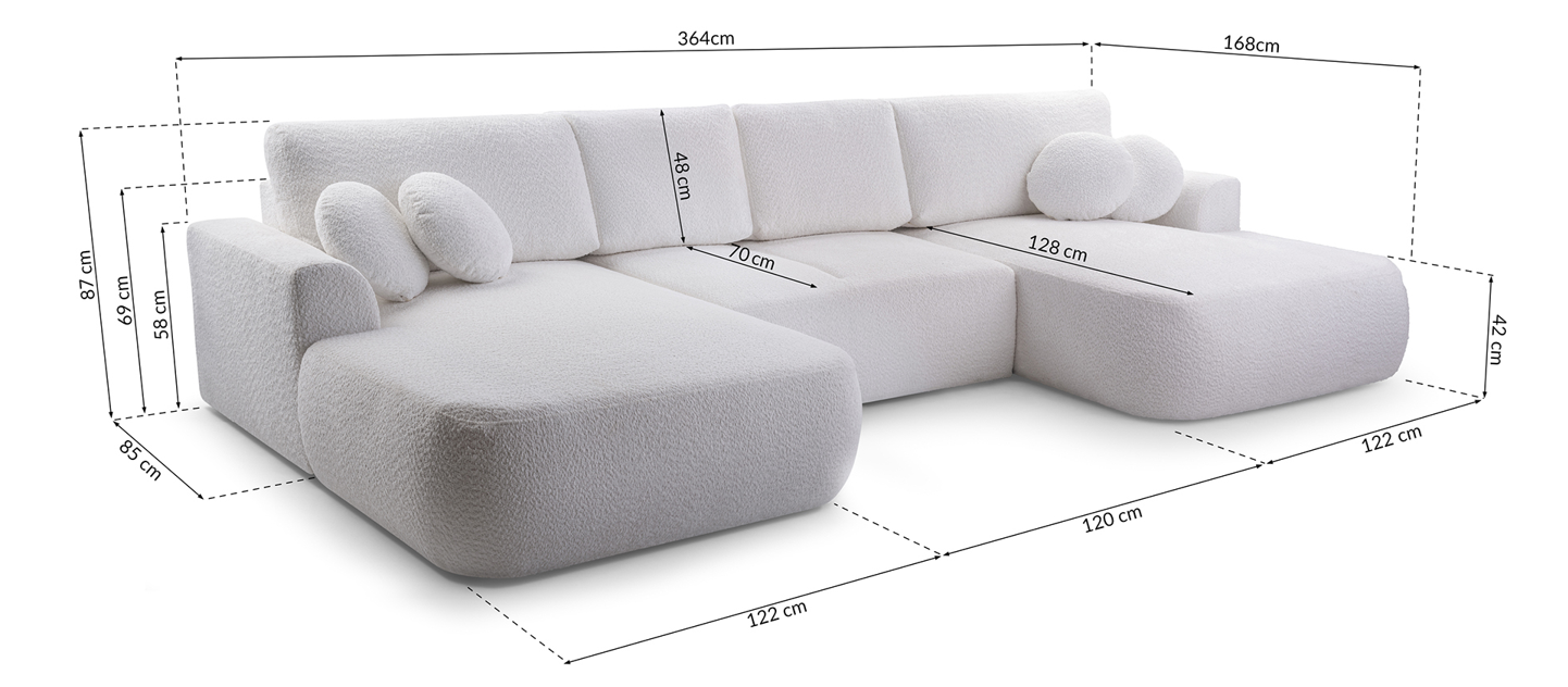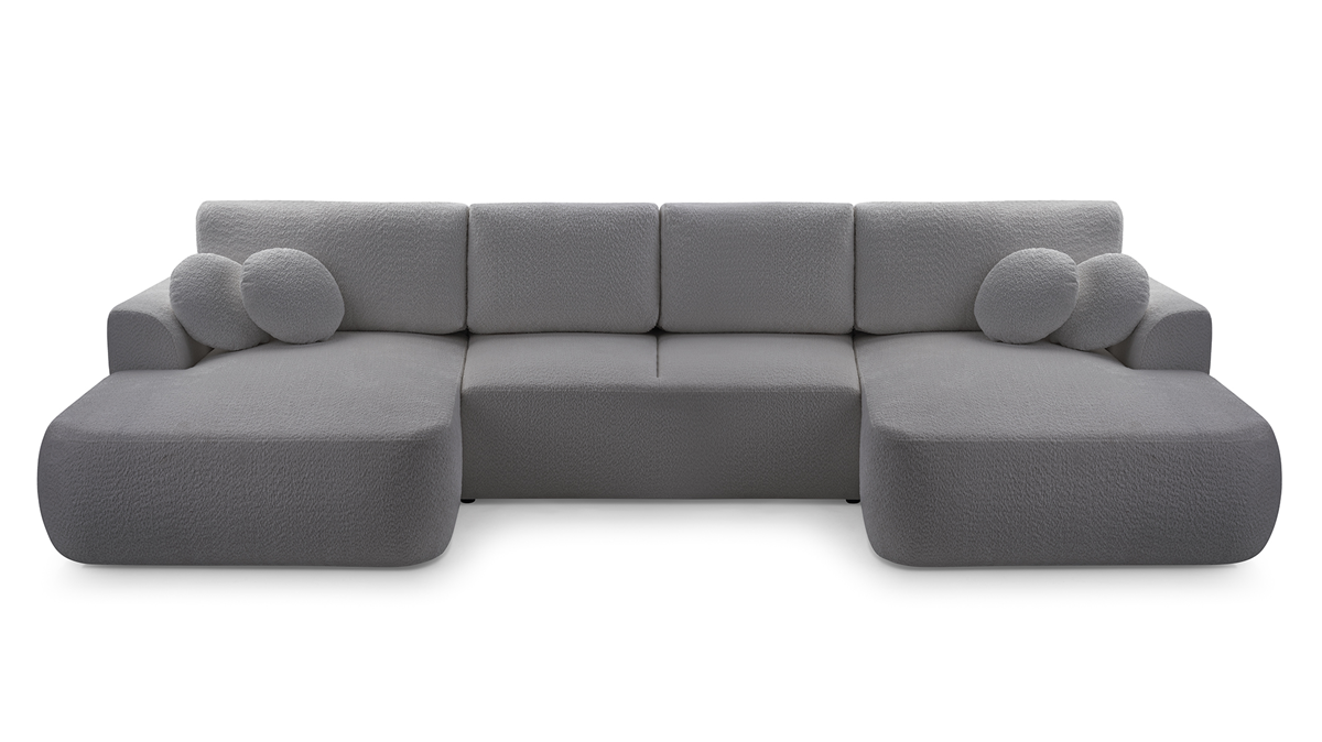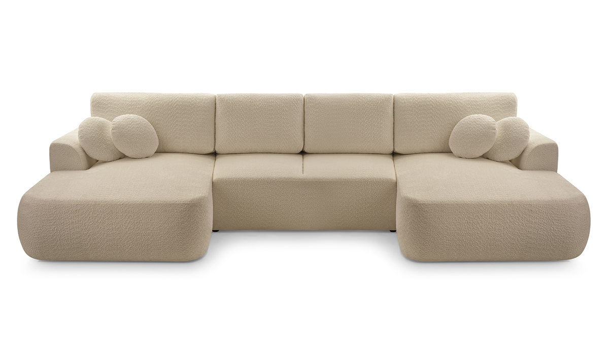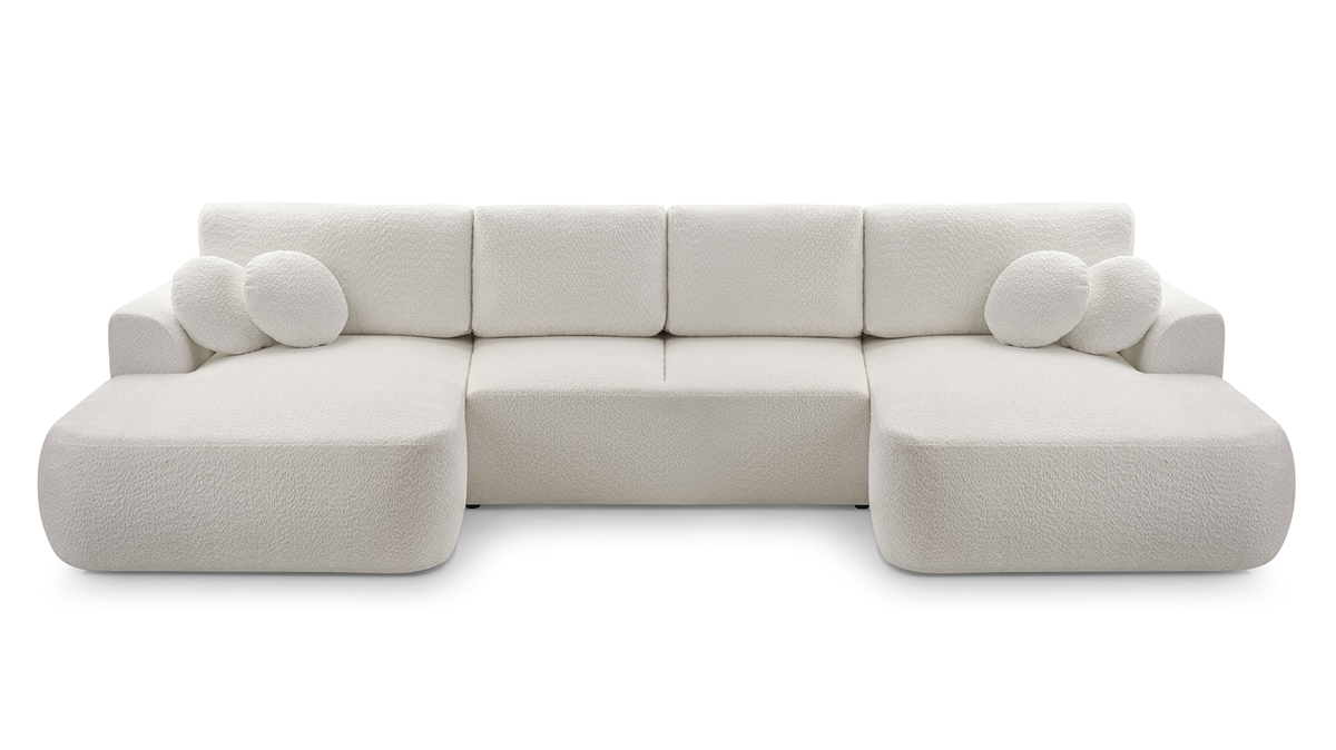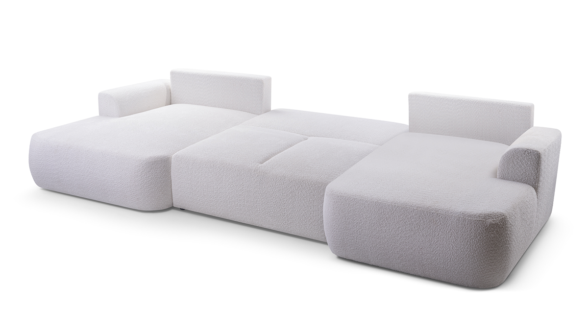 Narożnik LOREN U z funkcją spania i pojemnikiem na pościel to idealne połączenie elegancji i praktyczności. Jego nowoczesna forma, obita modną tkaniną boucle, wprowadza do wnętrza przytulny charakter i wyjątkowy styl. Dzięki funkcji spania narożnik w kilka chwil zamienia się w wygodne łóżko, a duży pojemnik na pościel zapewnia dodatkowe miejsce do przechowywania. To doskonały wybór do dużego salonu, który łączy komfort codziennego użytkowania z funkcjonalnością na co dzień i od święta. Kolekcja LOREN daje możliwość wyboru sofy, narożnika oraz opcji dla większych pomieszczeń - narożnika w kształcie litery U. Pozostałe warianty kolekcji sprawdź w innych ofertach.